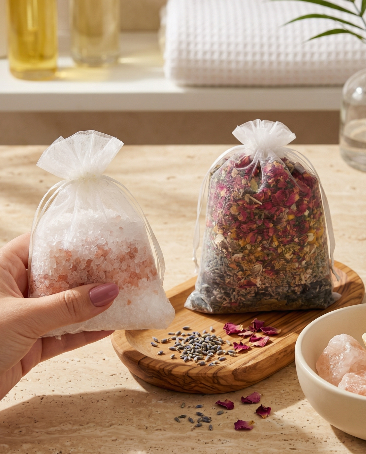 Start by dropping the tea into a warm bath, add the salts to the soak, and finish with a refreshing mitt exfoliation.